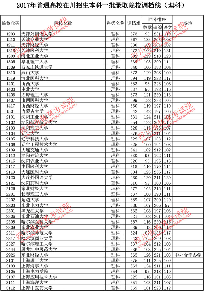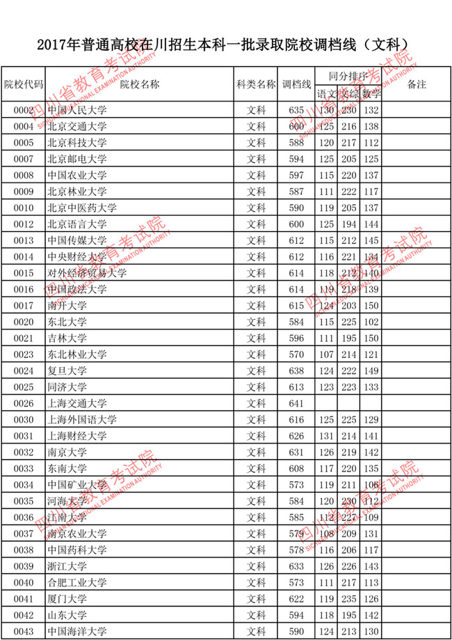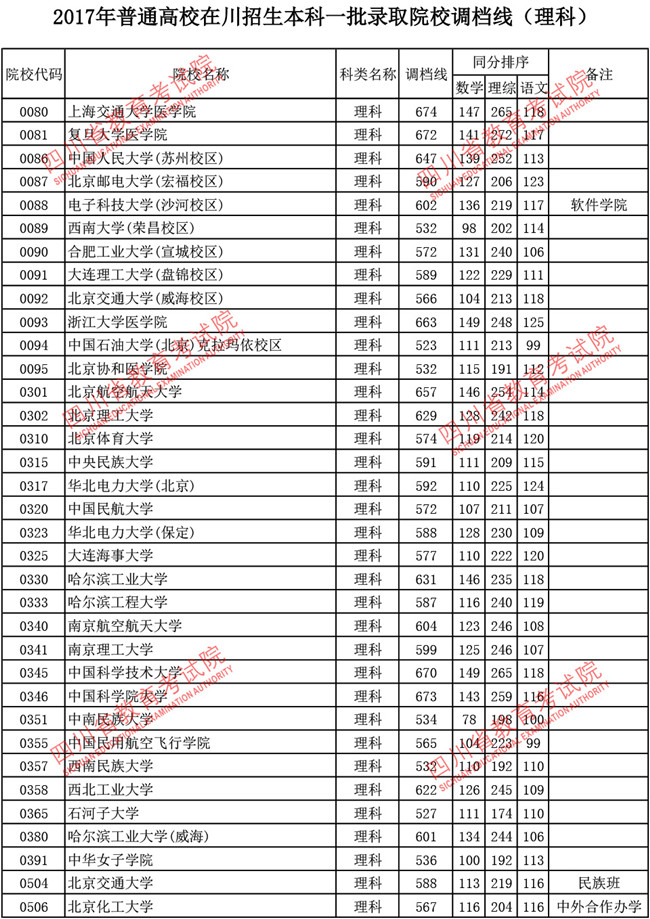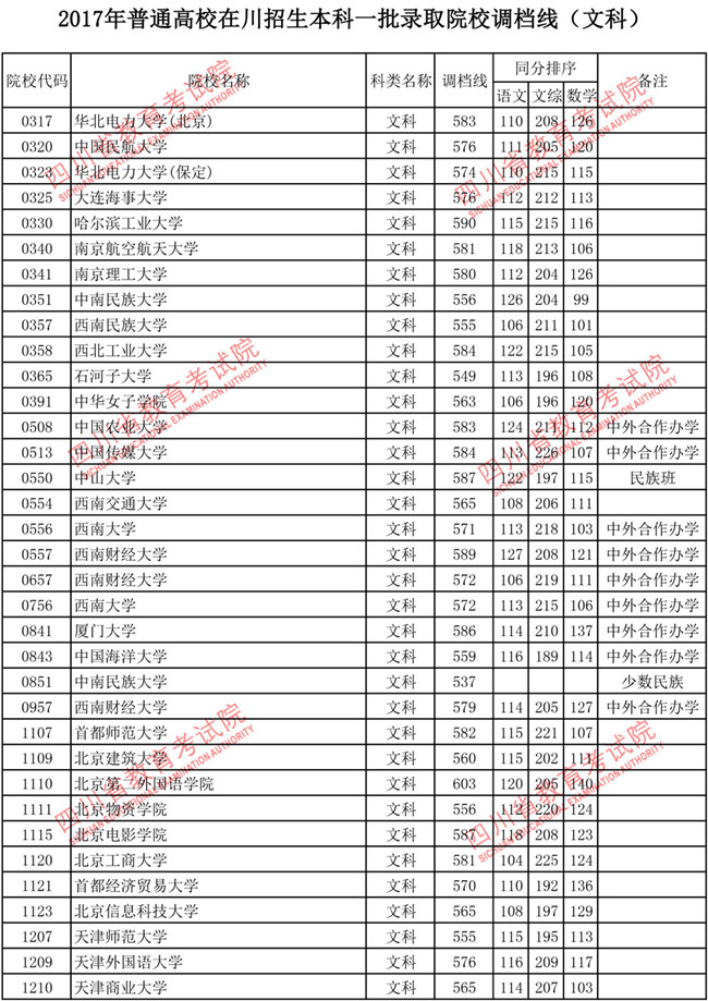 2017年普通高校在川招生本科一批调档线