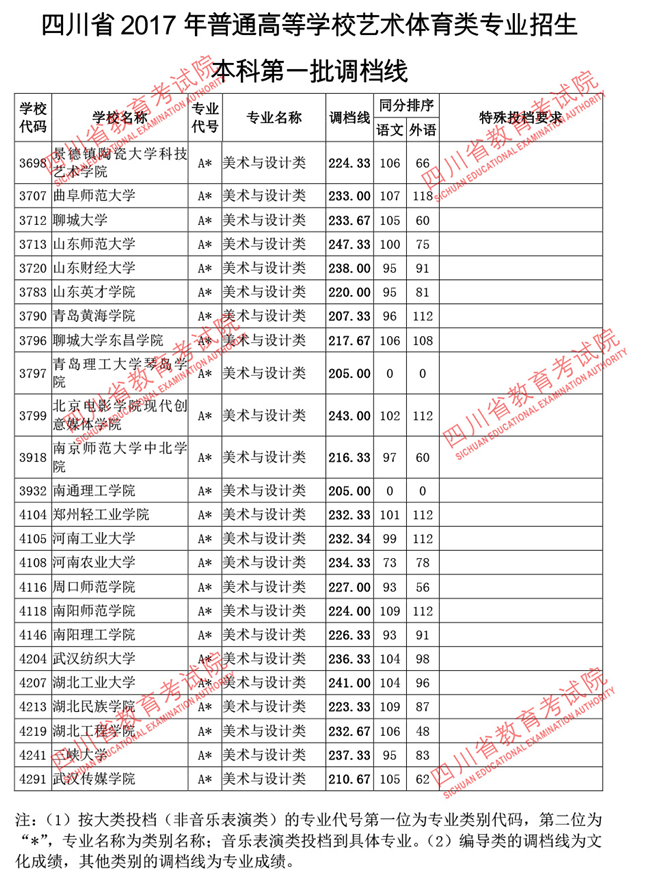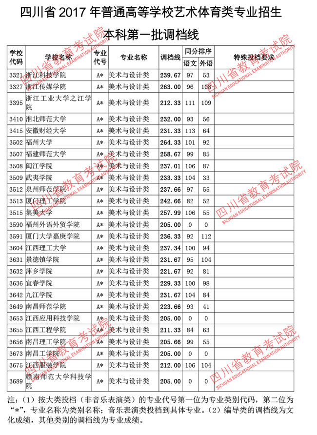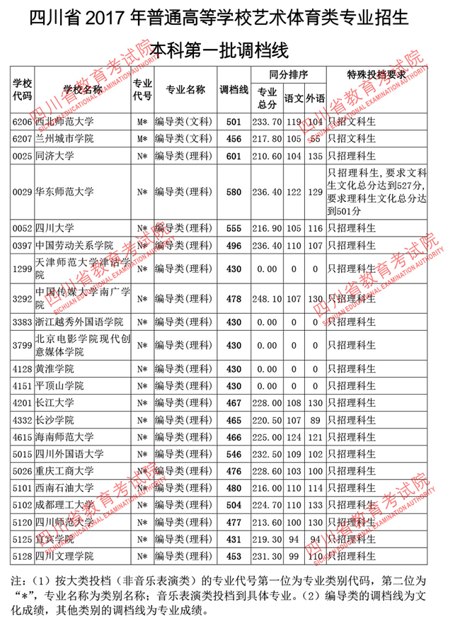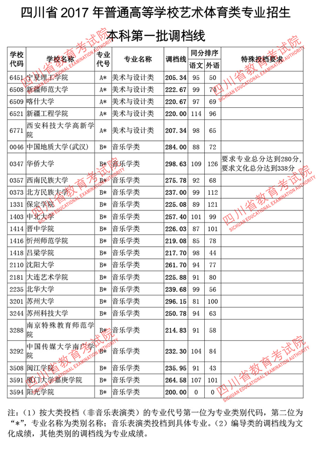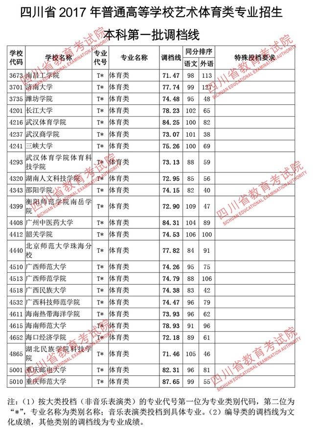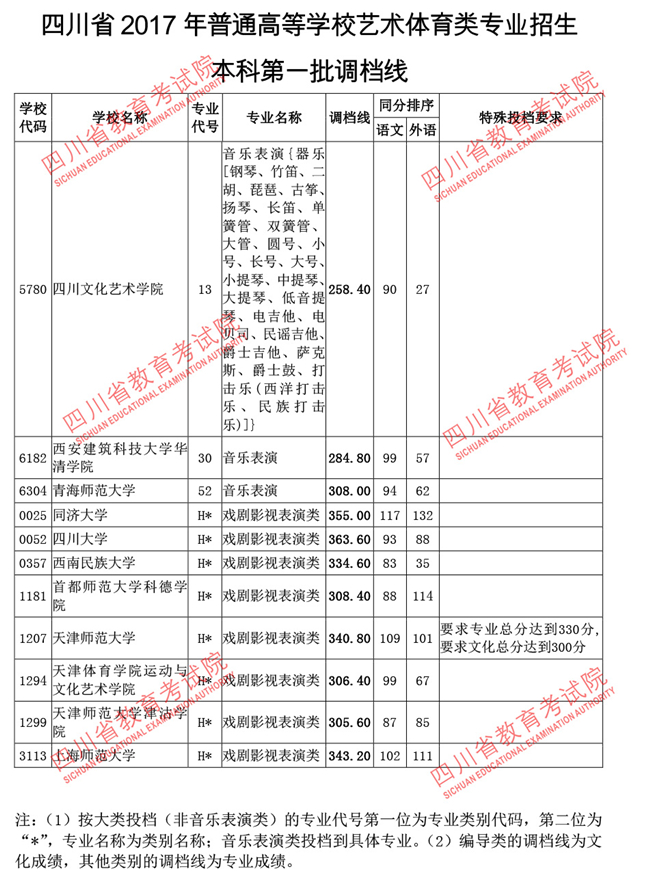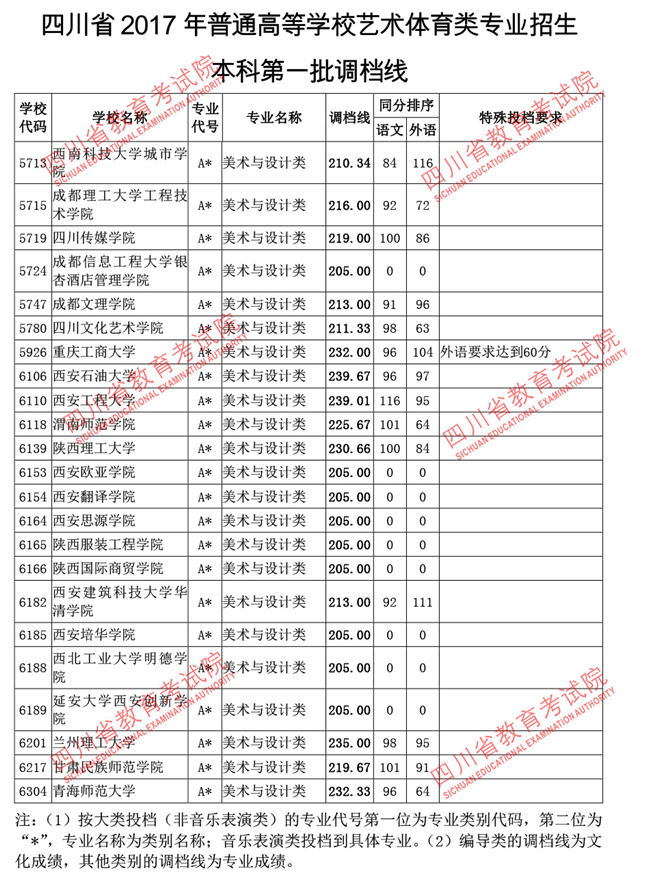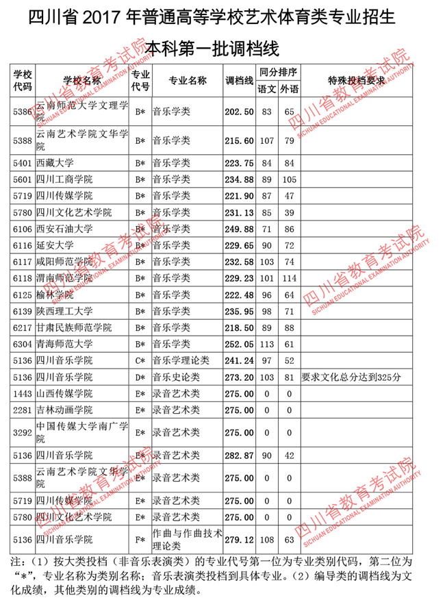 四川省2017年普通高等学校艺术体育类专业招生本科第一批调档线