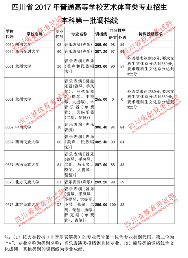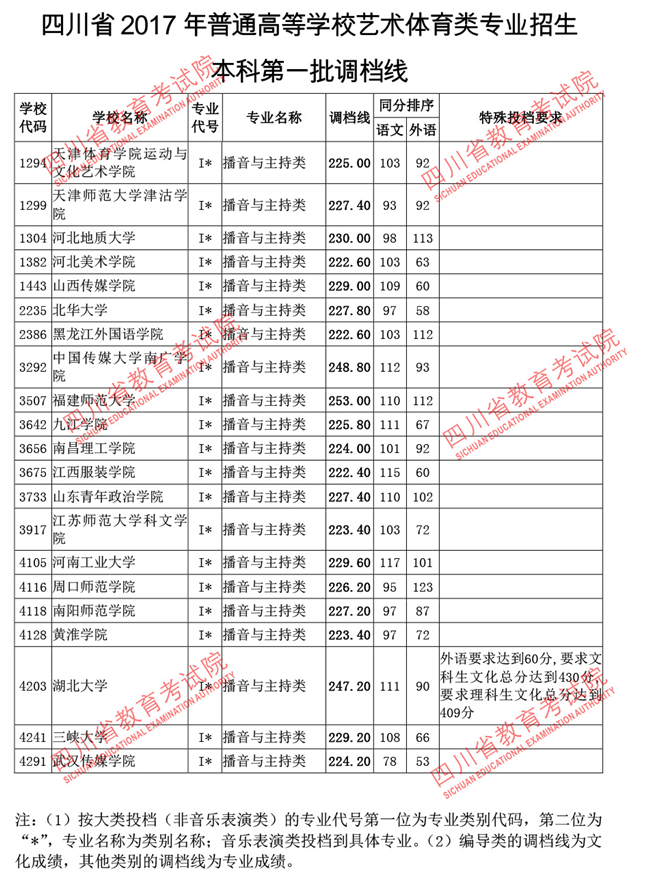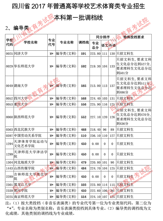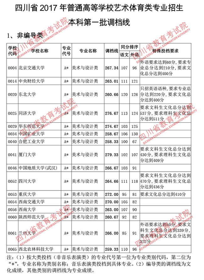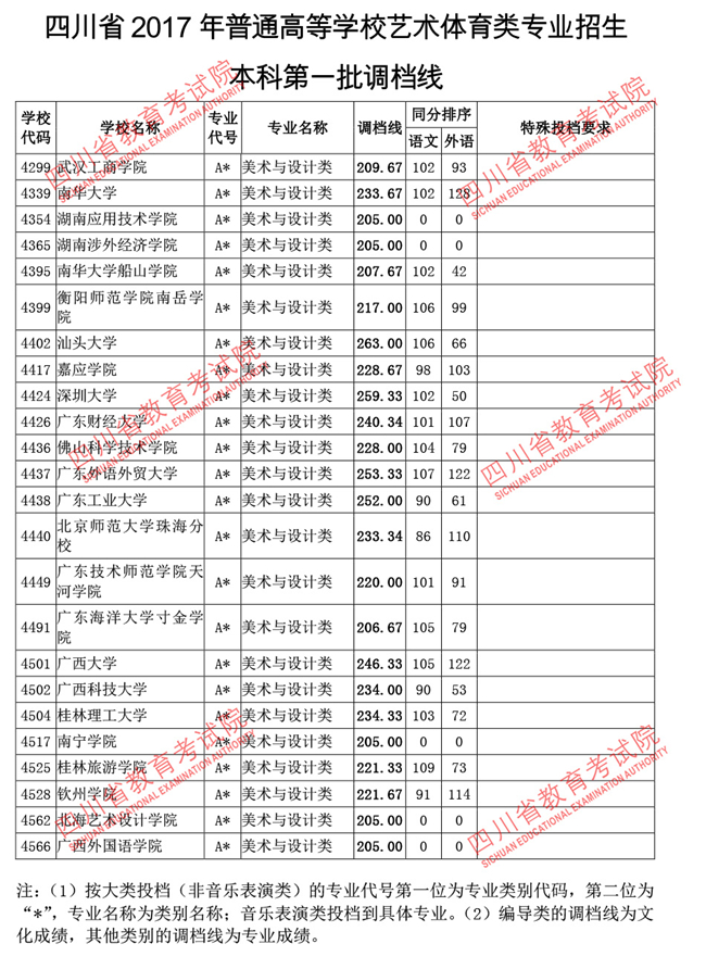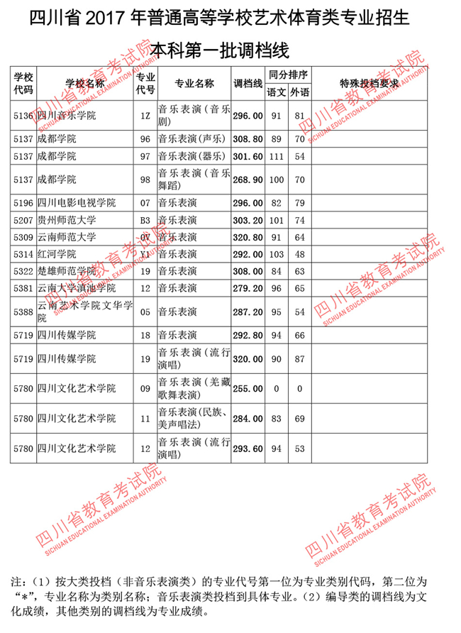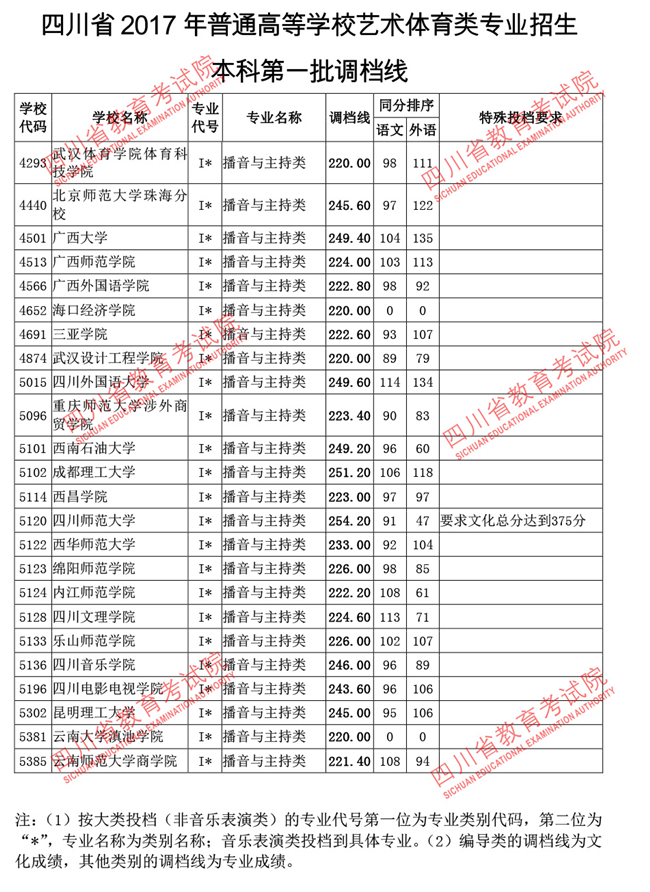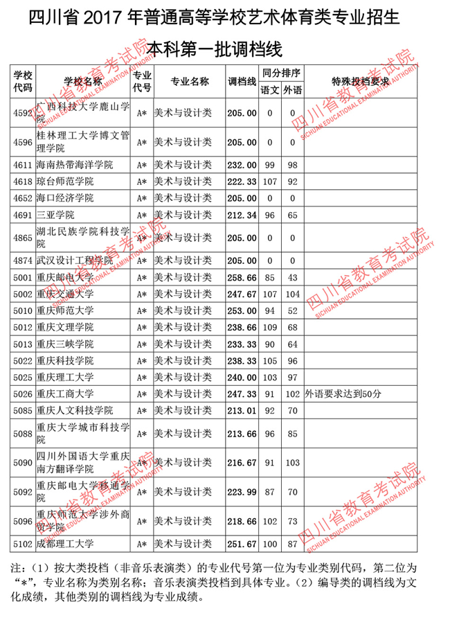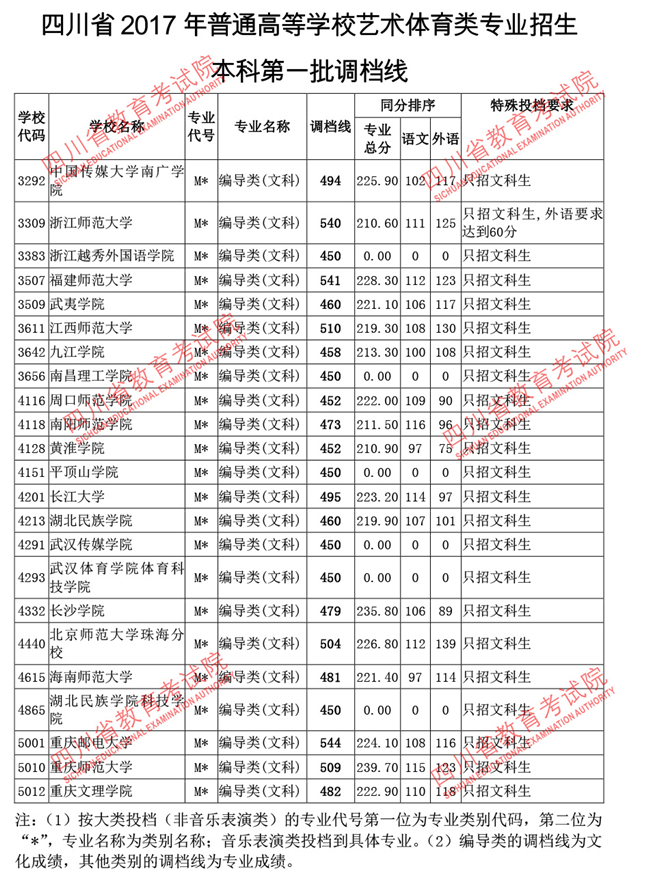 四川省2017年普通高等学校艺术体育类专业招生本科第一批调档线