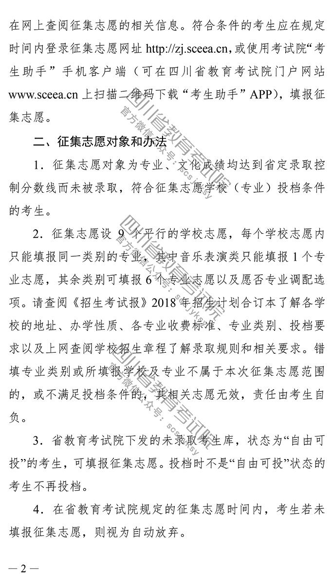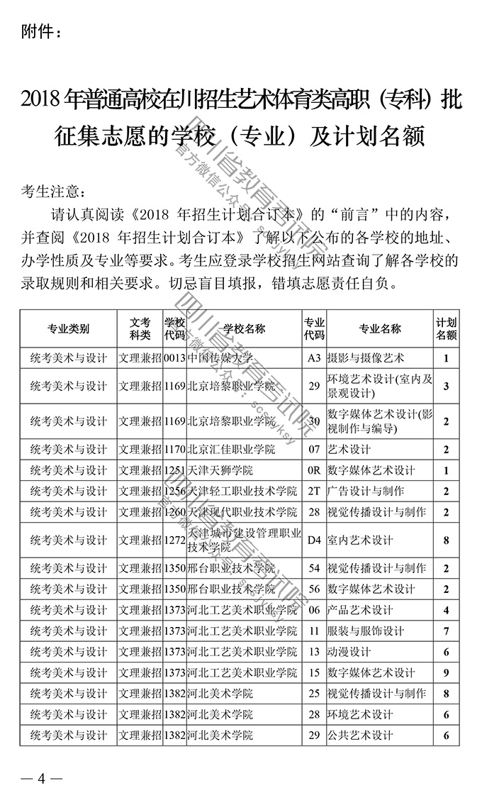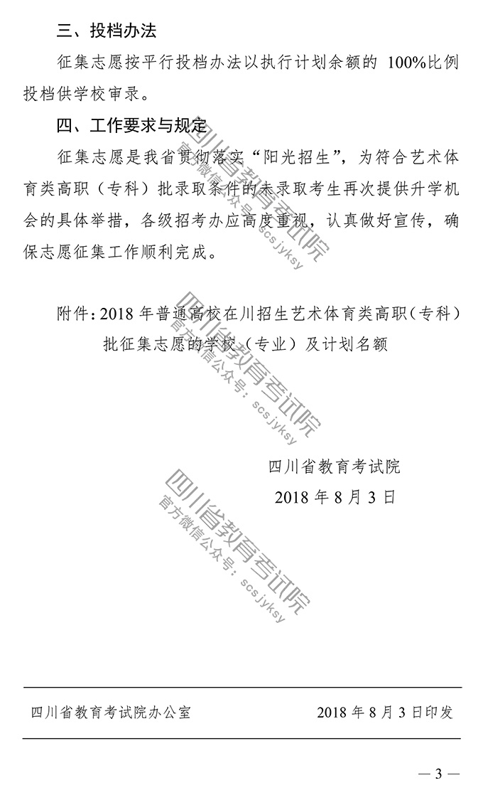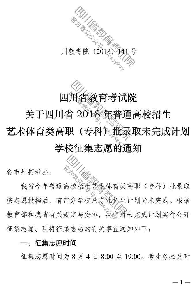 关于四川省2018年普通高校招生艺术体育类高职(专科)批录取未完成计划学校征集志愿的通知