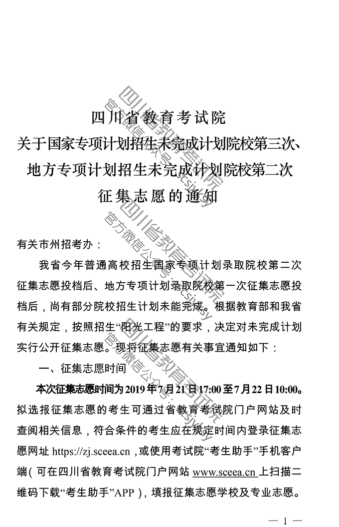 关于国家专项计划招生未完成计划院校第三次、地方专项计划招生未完成计划院校第二次征集志愿的通知