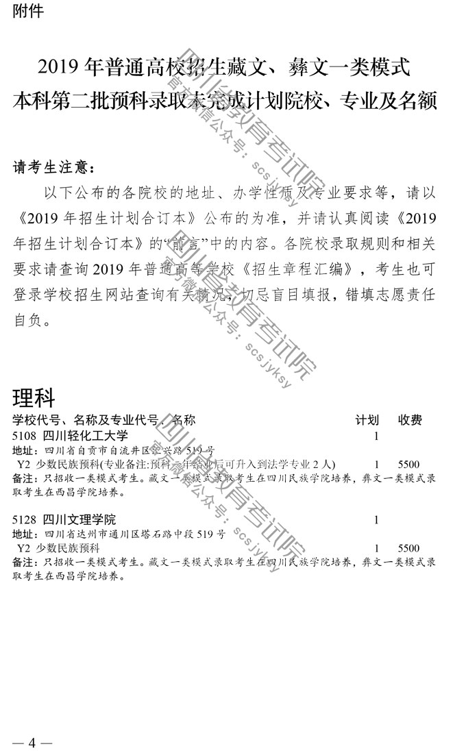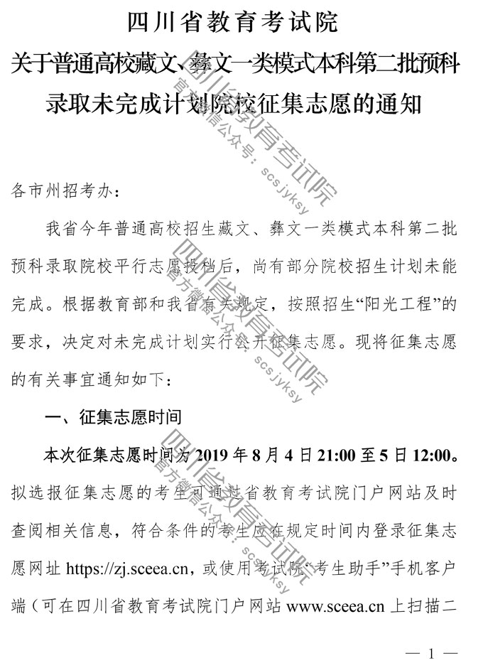 关于普通高校藏文、彝文一类模式本科第二批预科录取未完成计划院校征集志愿的通知