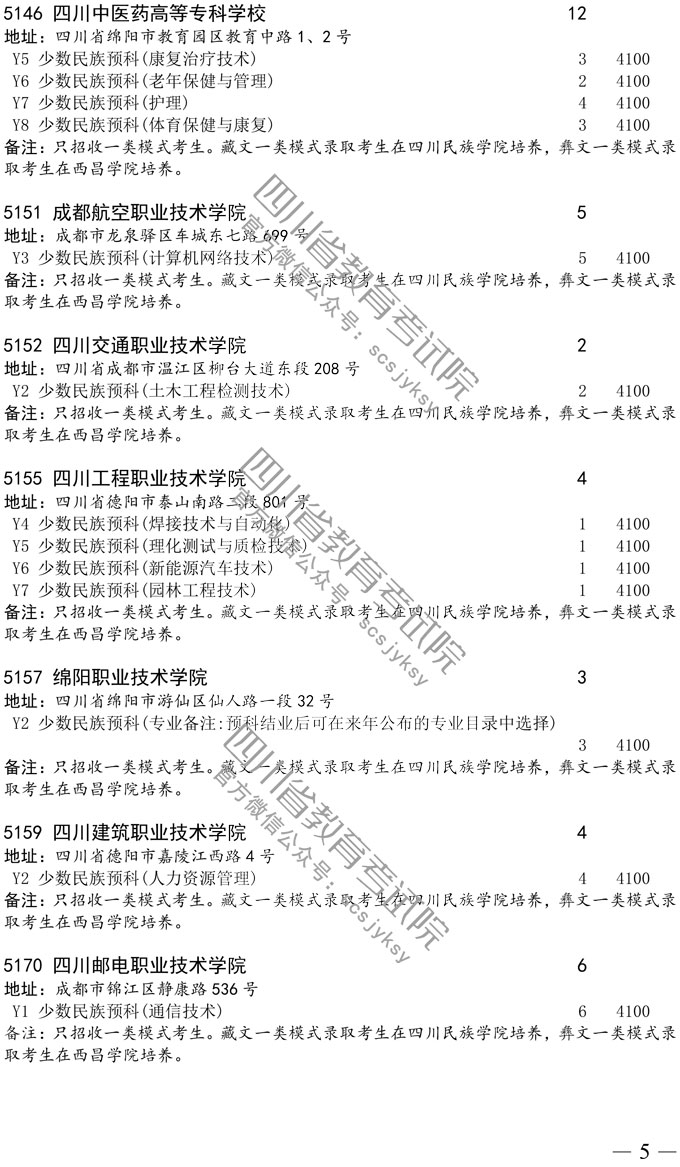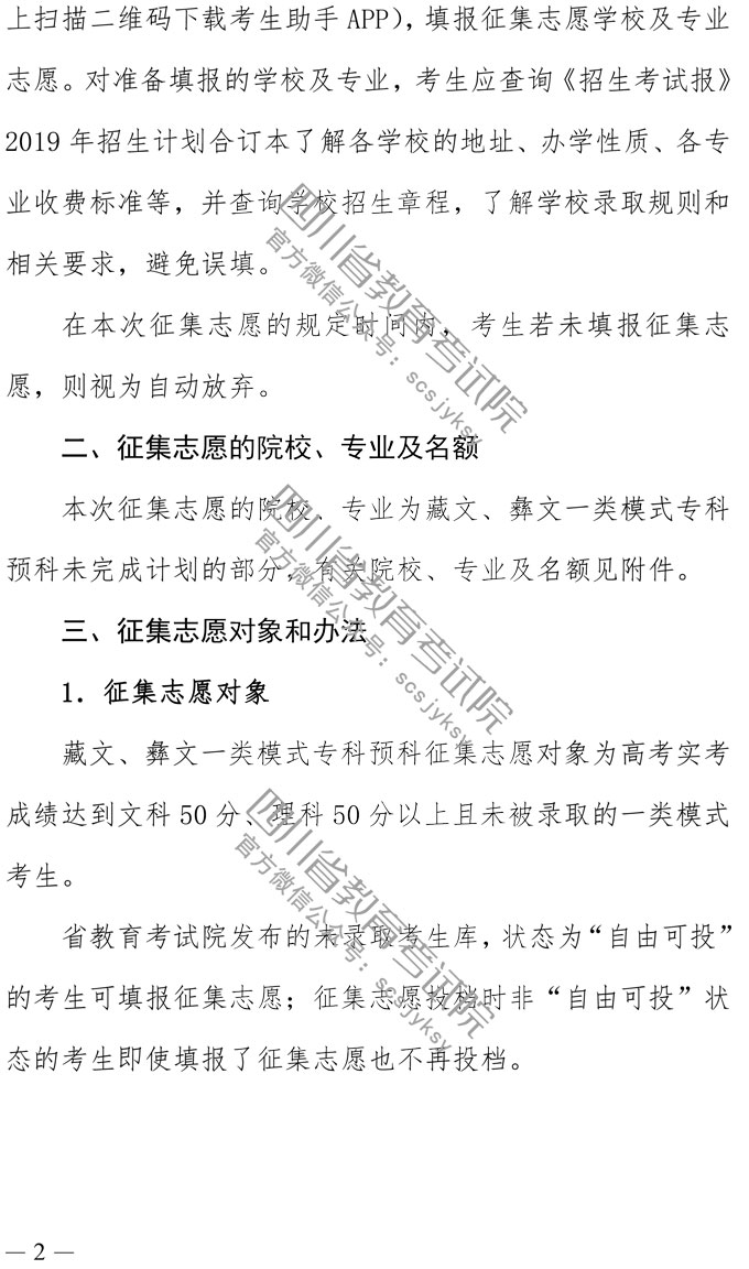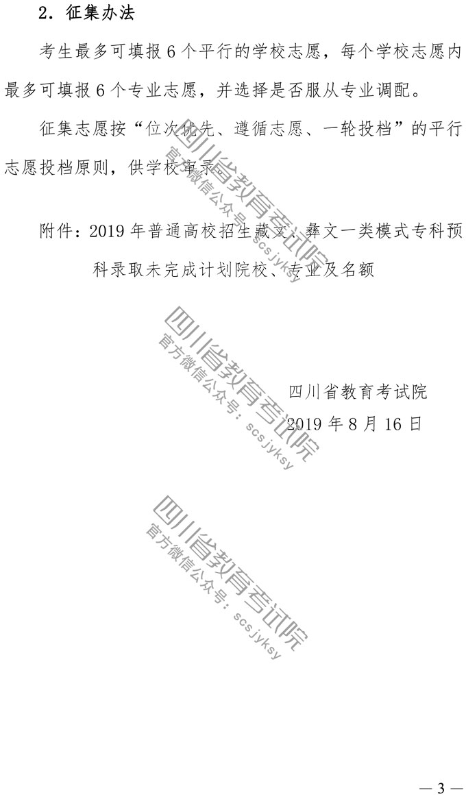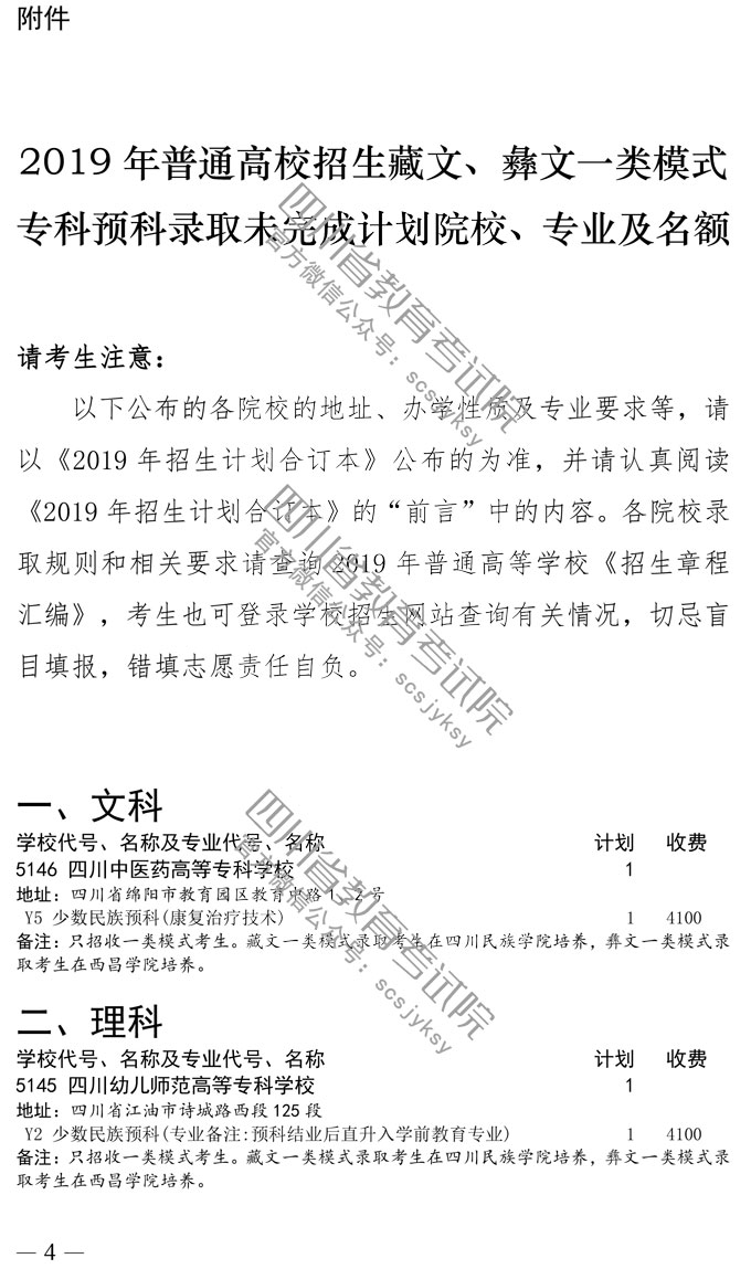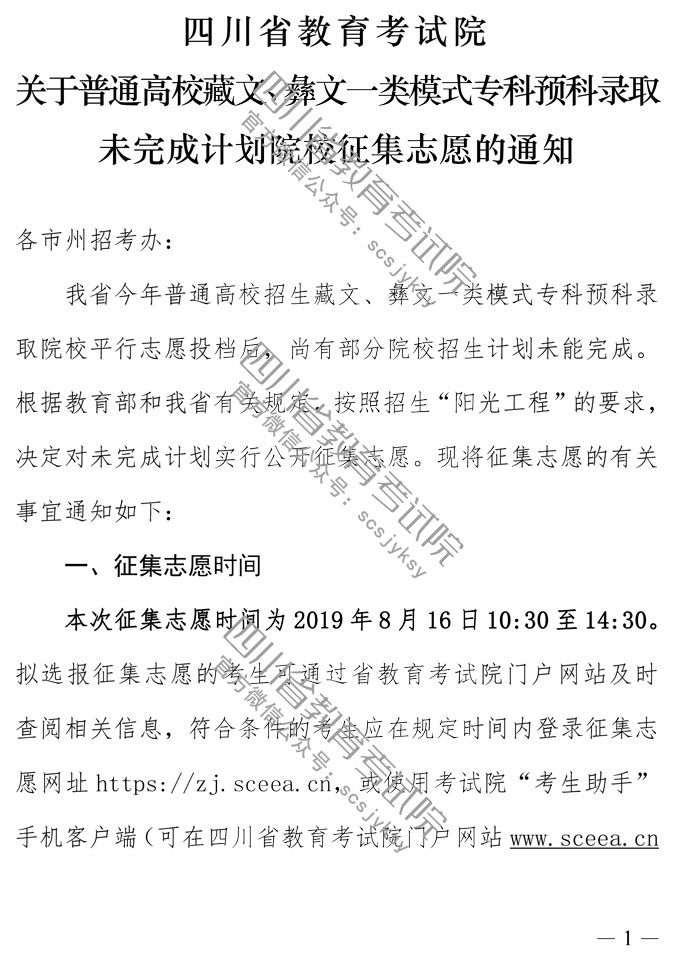 关于普通高校藏文、彝文一类模式专科预科录取未完成计划院校征集志愿的通知