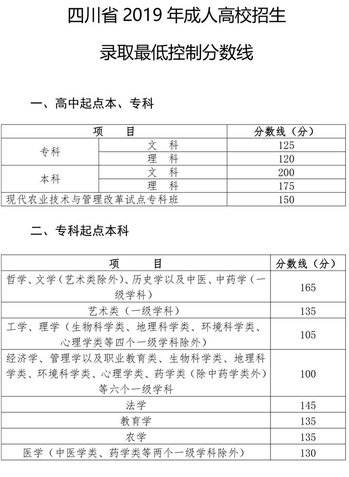 附件:四川省2019年成人高校招生录取最低控制分数线