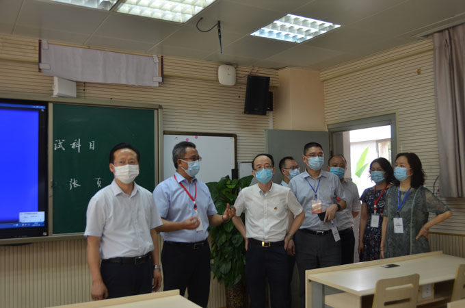 考点现场,省卫生健康委副主任徐斌和省教育考试院院长刘敏一行实地检查了考场布置、入口体温检测、专用通道设置,备用考室、考点考务指挥中心等,详细了解考点疫情防控措施落实、考务工作安排、后勤服务保障等情况,并现场收听防疫提示音频。在视频监控室,徐斌和刘敏一行观看前来“踩点”的考生熟悉考场的各个环节,现场体验高考流程。听完石室中学校长田间介绍疫情防控和考务工作后,徐斌和刘敏一行对石室中学的组考工作给予肯定,并强调高考在即,要统筹抓好疫情防控和高考考务工作,科学精准制定应急预案,落实好各项防控措施。要全力做好考试服务,为广大考生提供安全、舒适的考试环境。