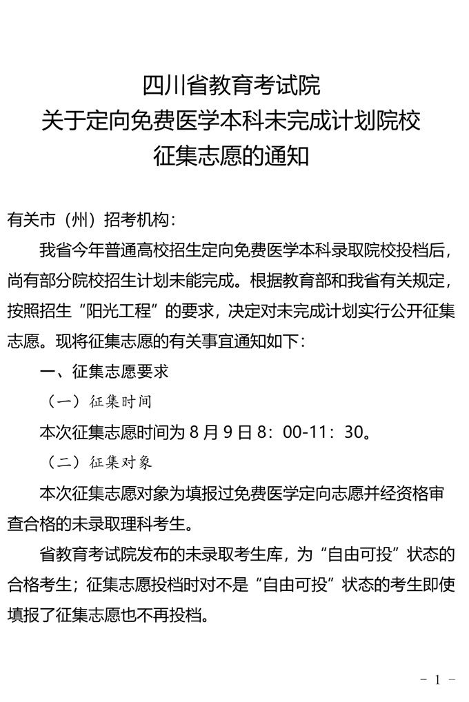 关于定向免费医学本科未完成计划院校征集志愿的通知