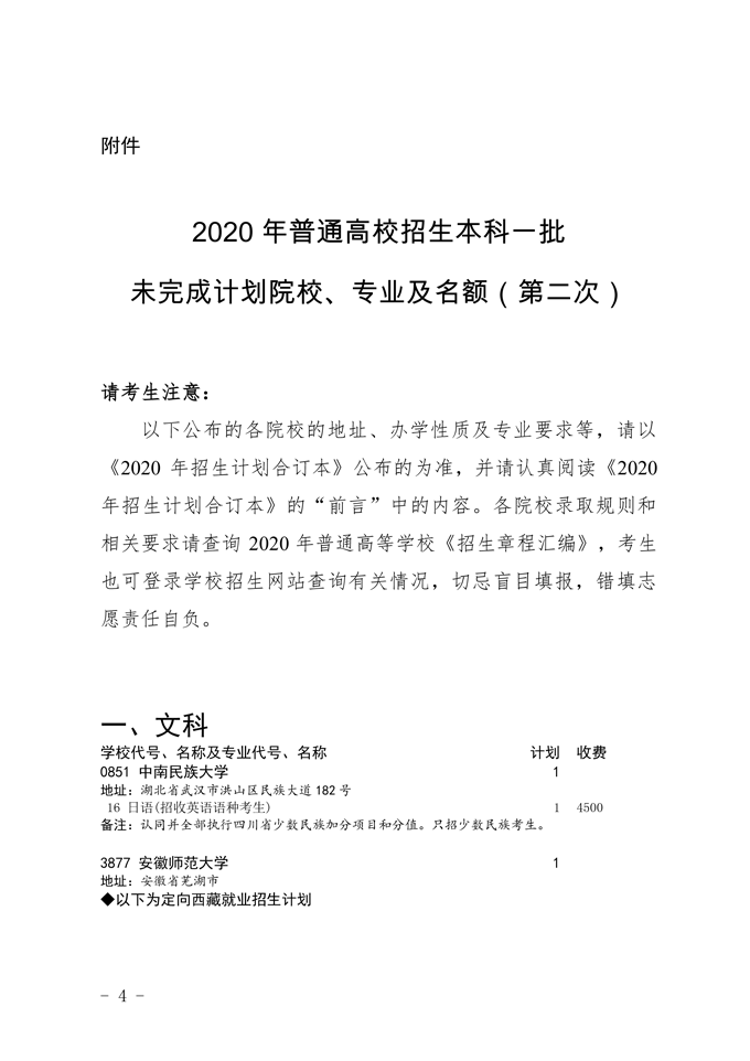 附件:2020年普通高校招生本科第一批未完成计划院校、专业及名额(第二次)