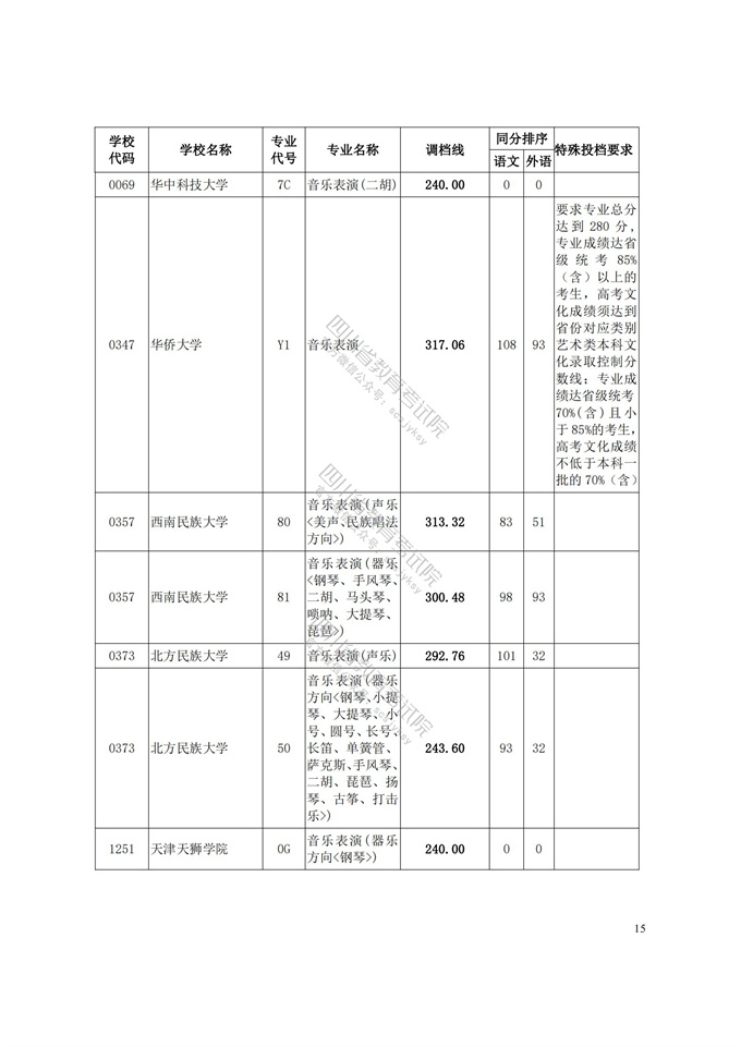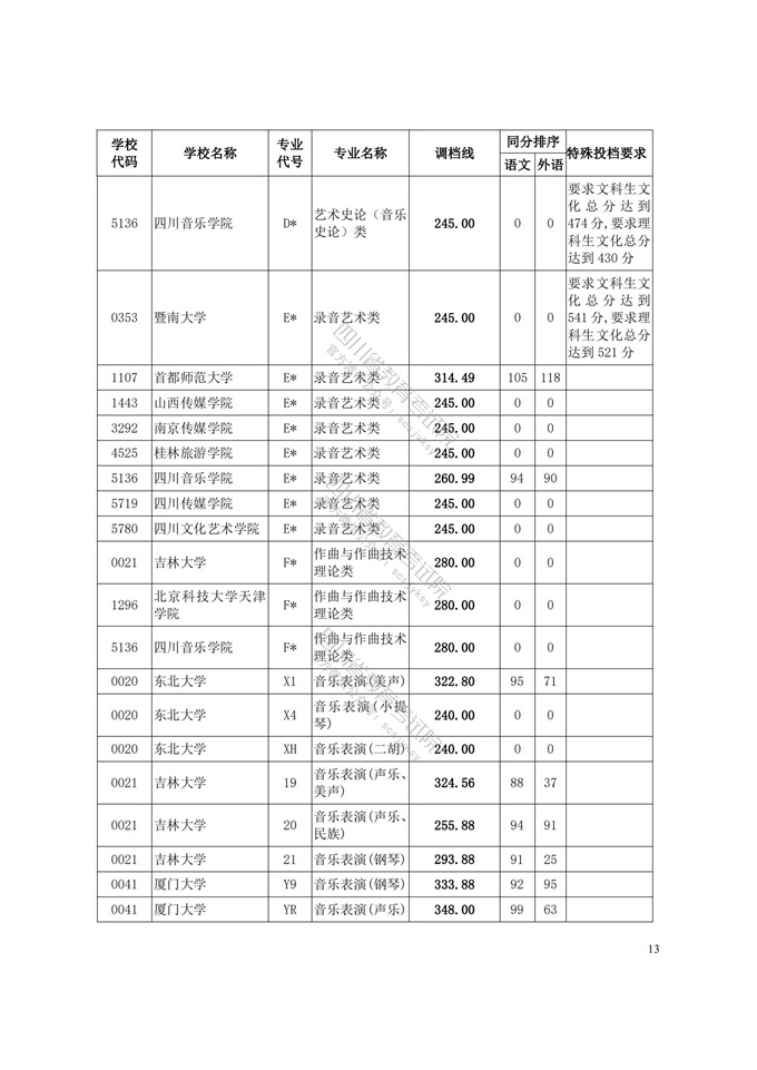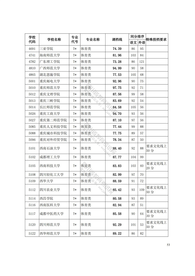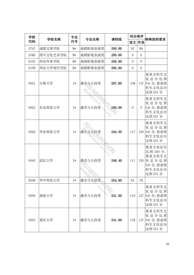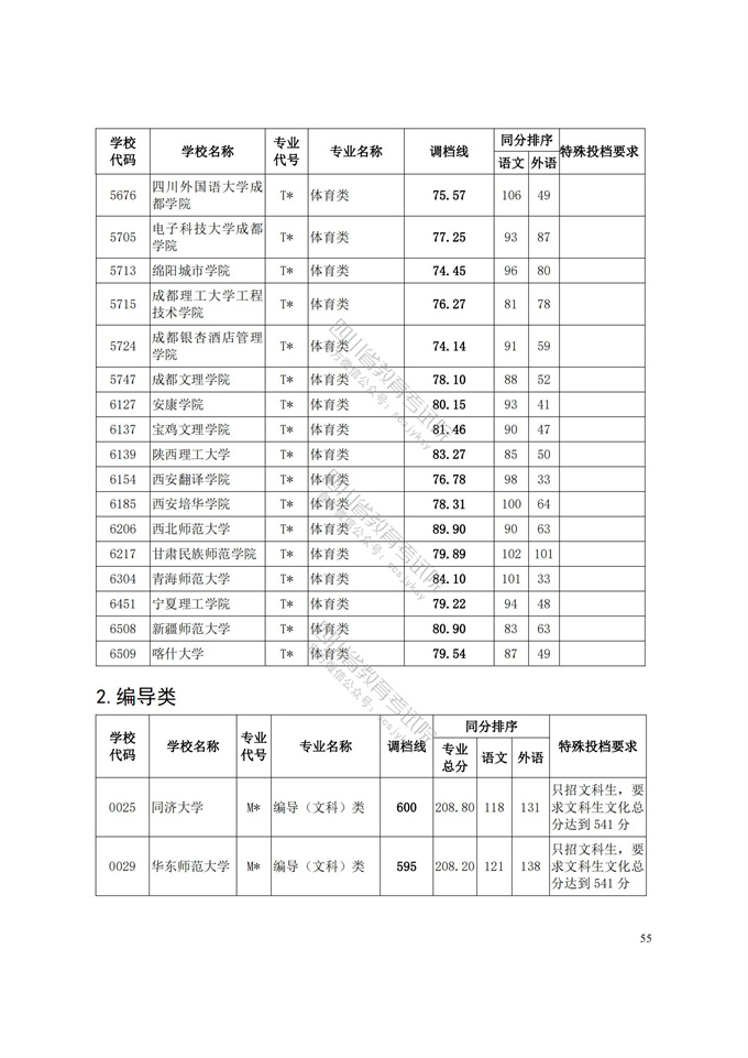 四川省2021年普通高等学校艺术体育类专业招生艺术类本科第一批、体育类本科批调档线