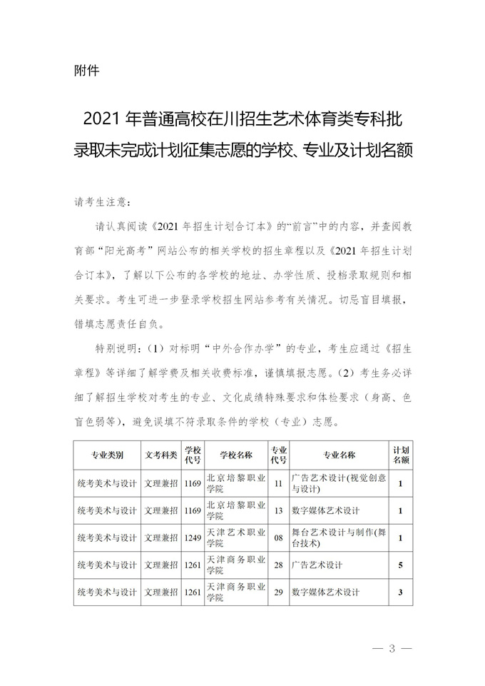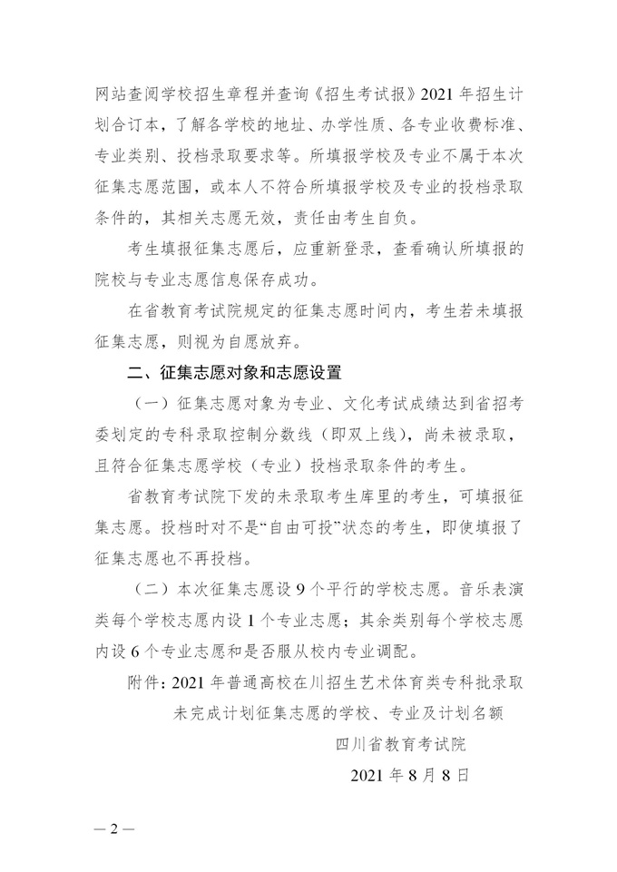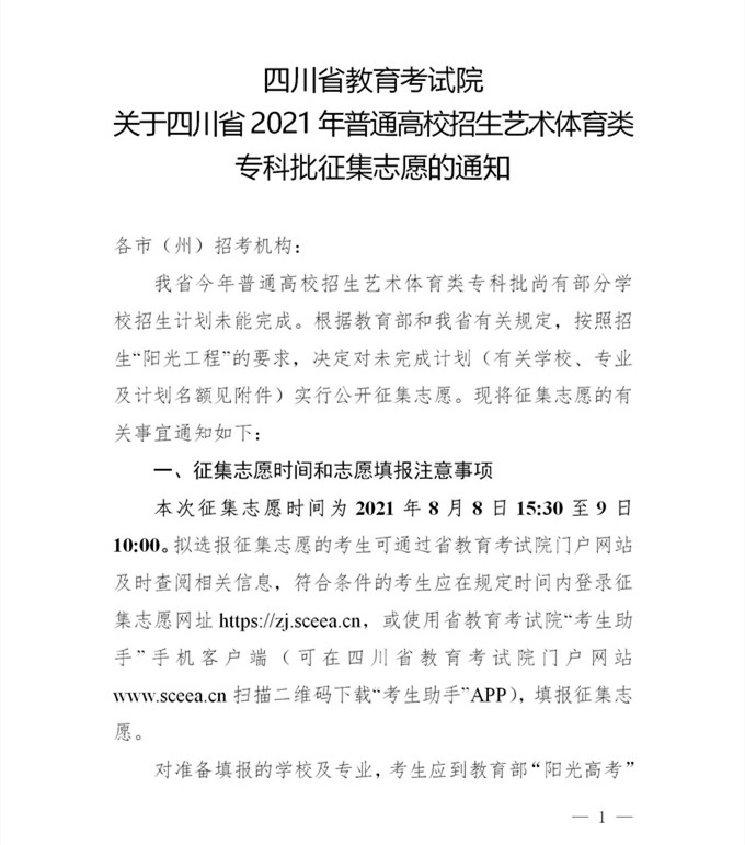关于四川省2021年普通高校招生艺术体育类专科批征集志愿的通知