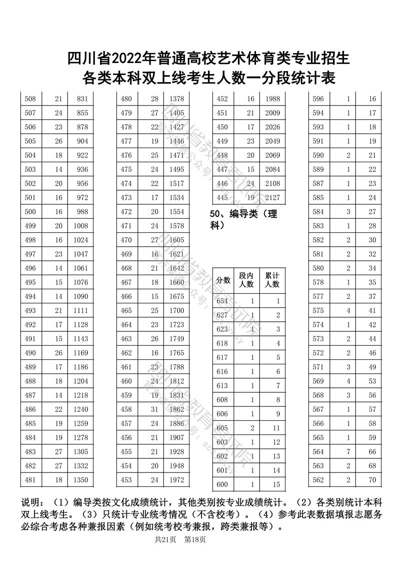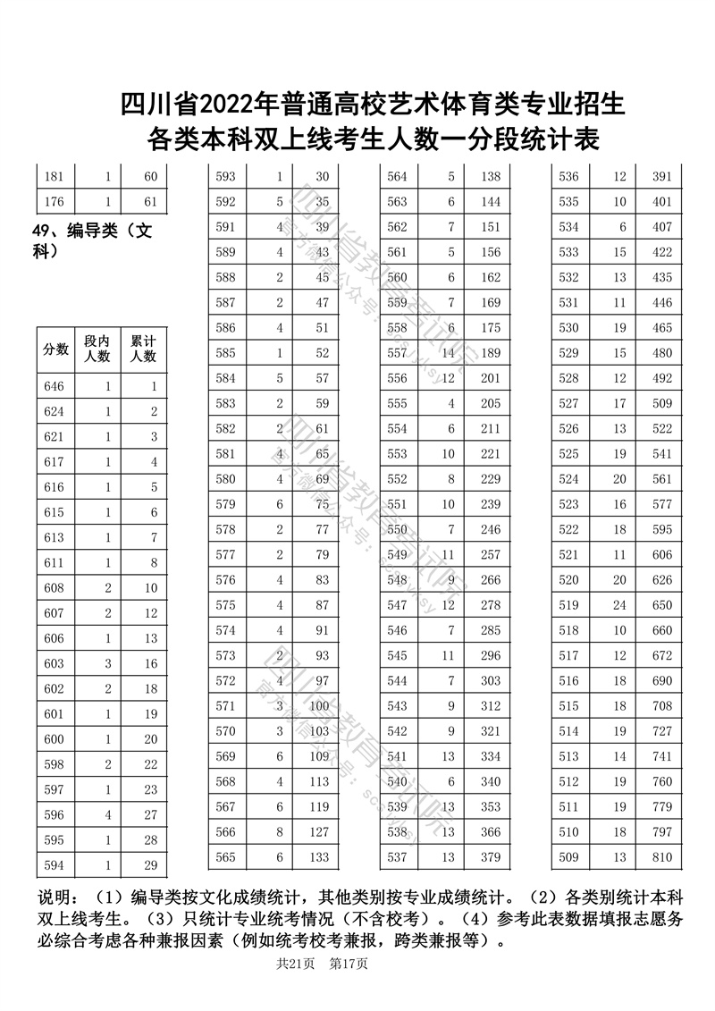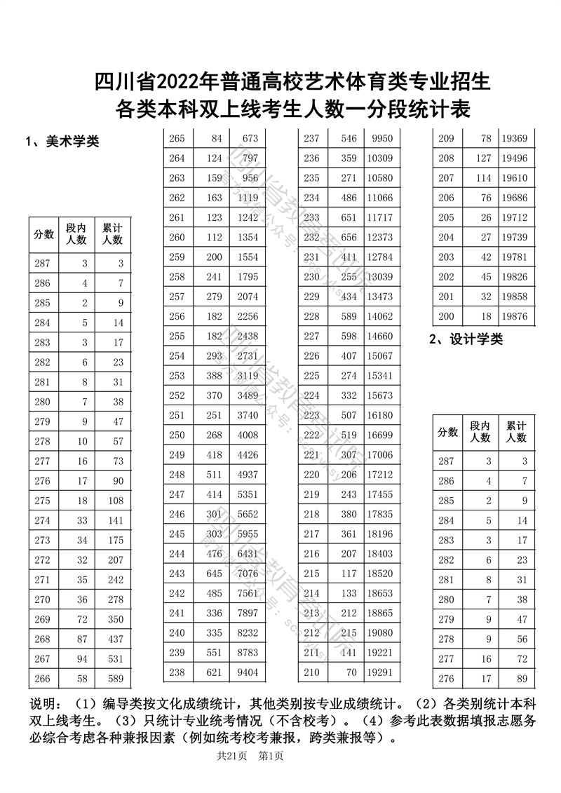 四川省2022年普通高校艺术体育类专业招生各类本科双上线考生人数一分段统计表