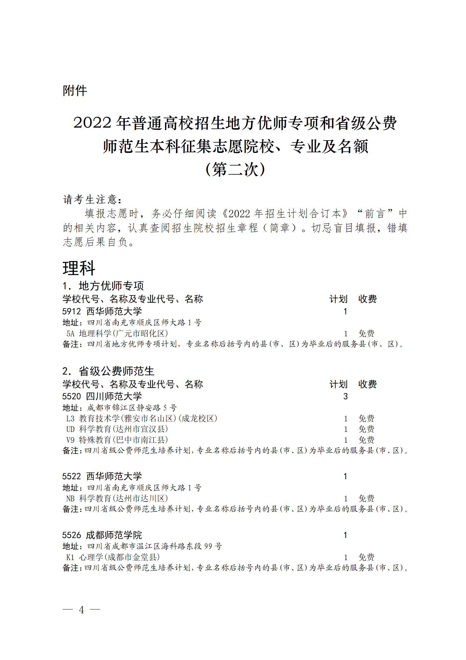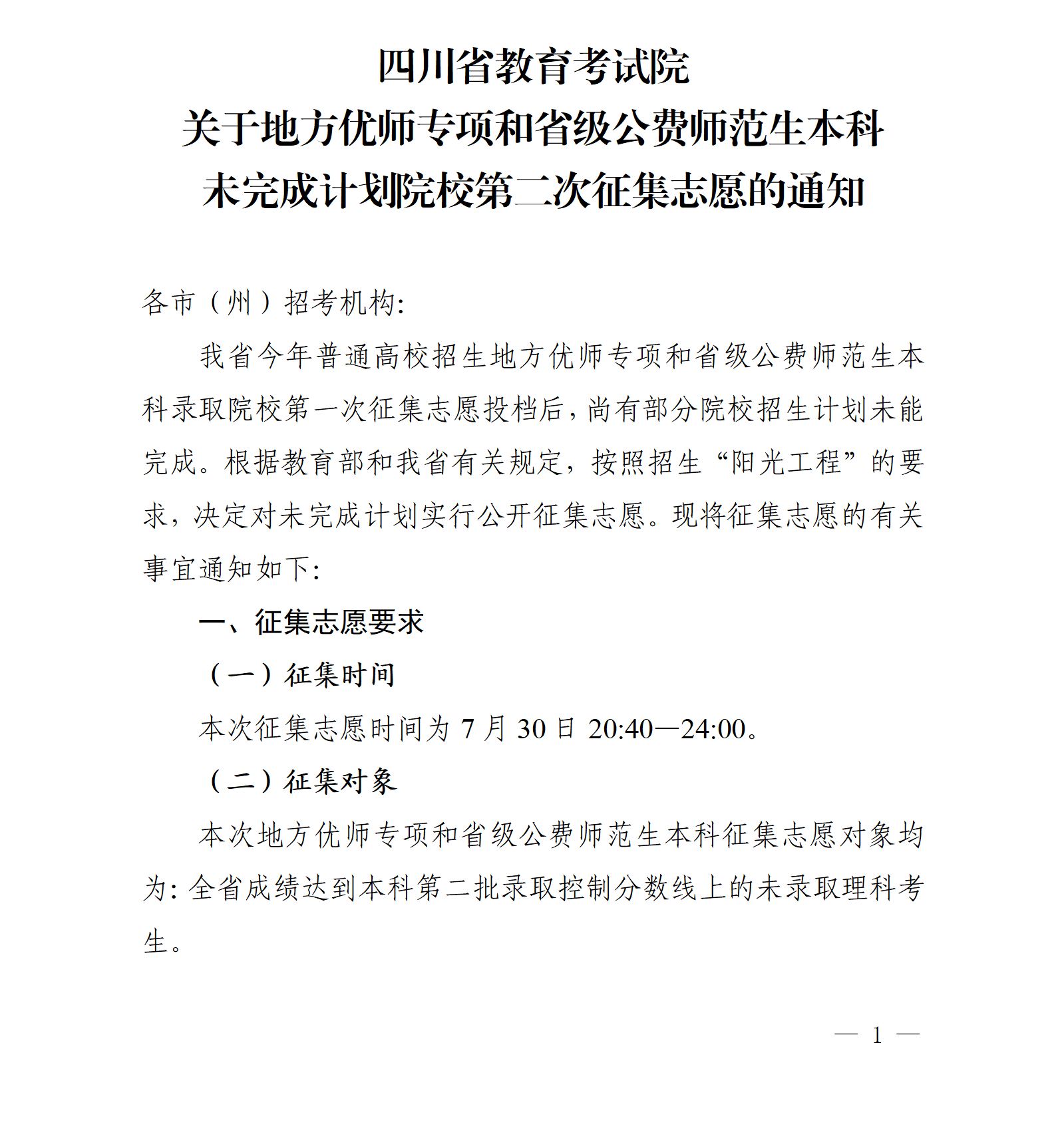 关于地方优师专项和省级公费师范生本科未完成计划院校第二次征集志愿的通知