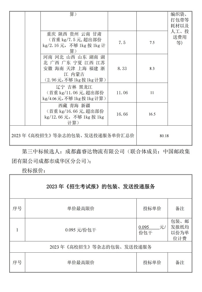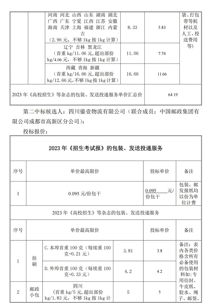 2023年《招生考试报》《高校招生》等报刊包装、发送投递服务项目(二次)结果公告