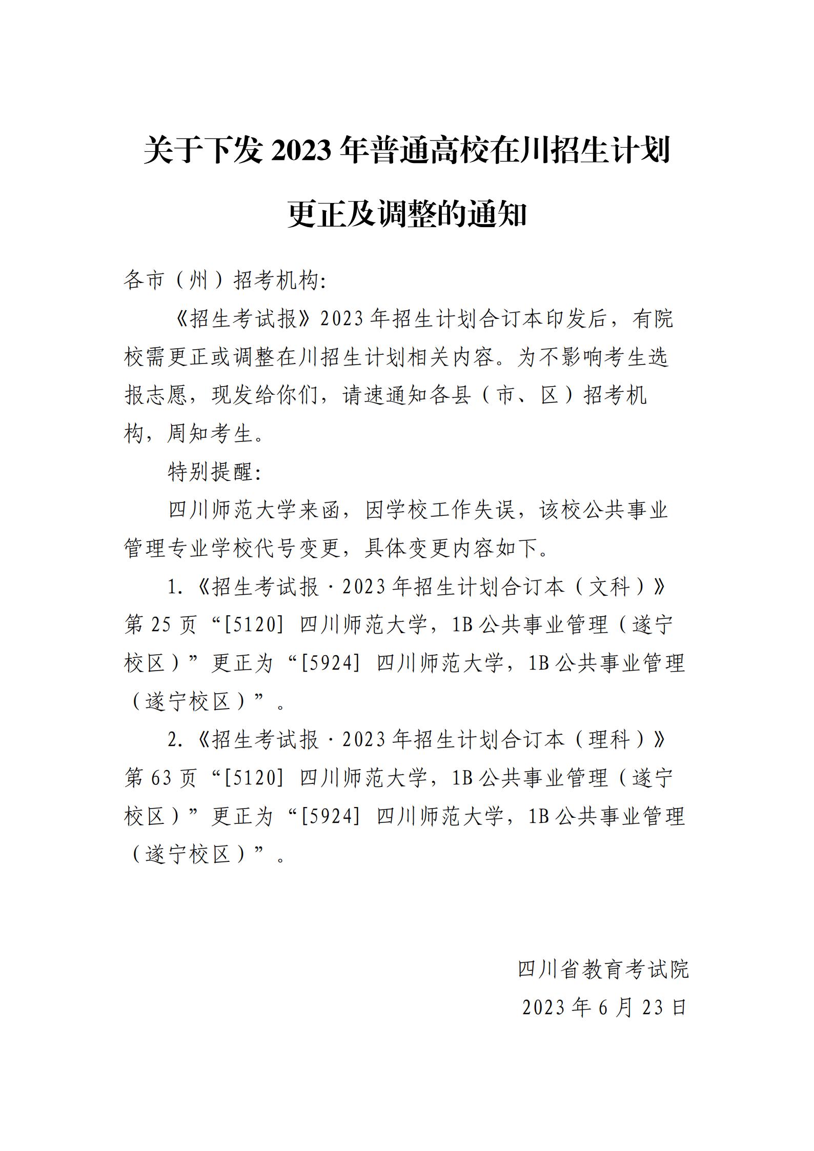 关于下发2023年普通高校在川招生计划更正及调整的通知