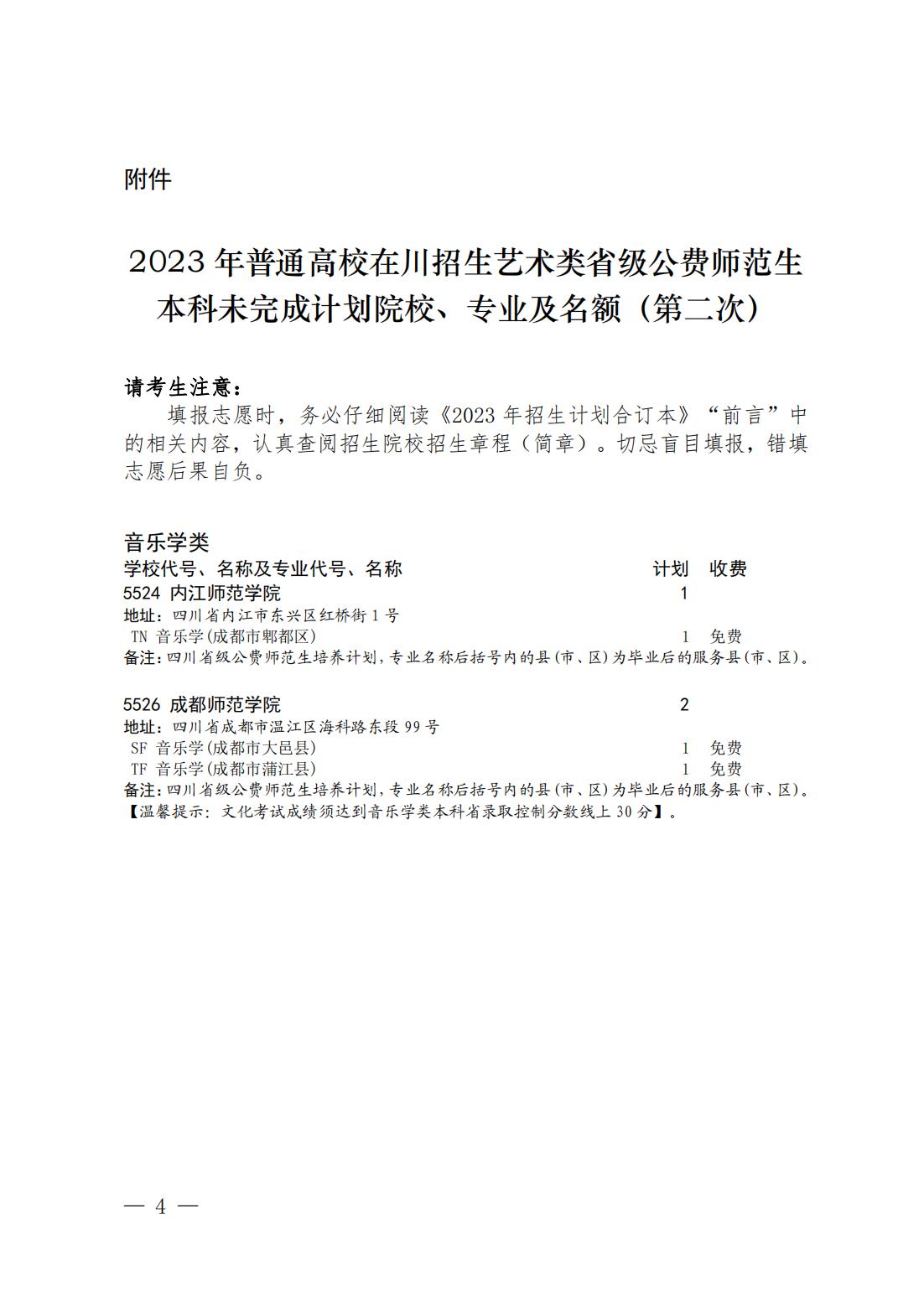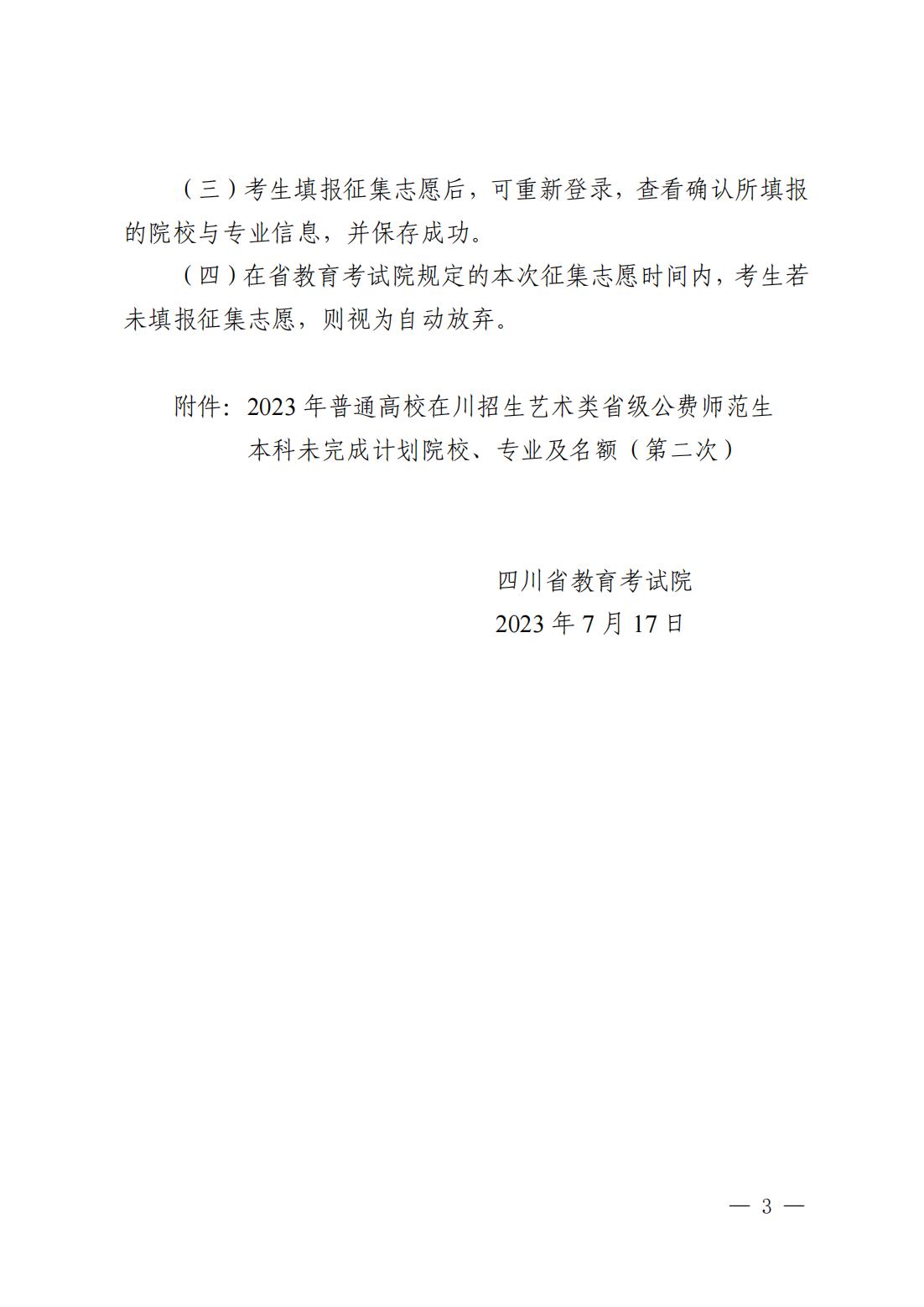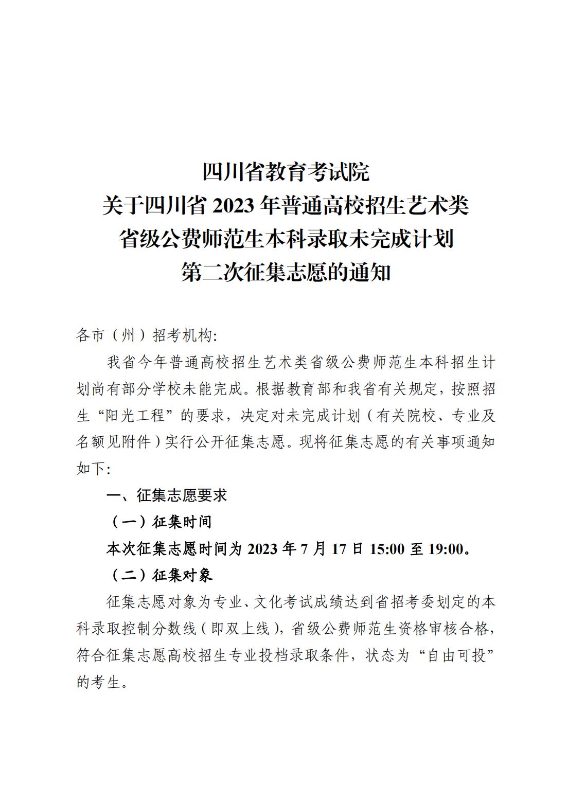 关于四川省2023年普通高校招生艺术类省级公费师范生本科录取未完成计划第二次征集志愿的通知