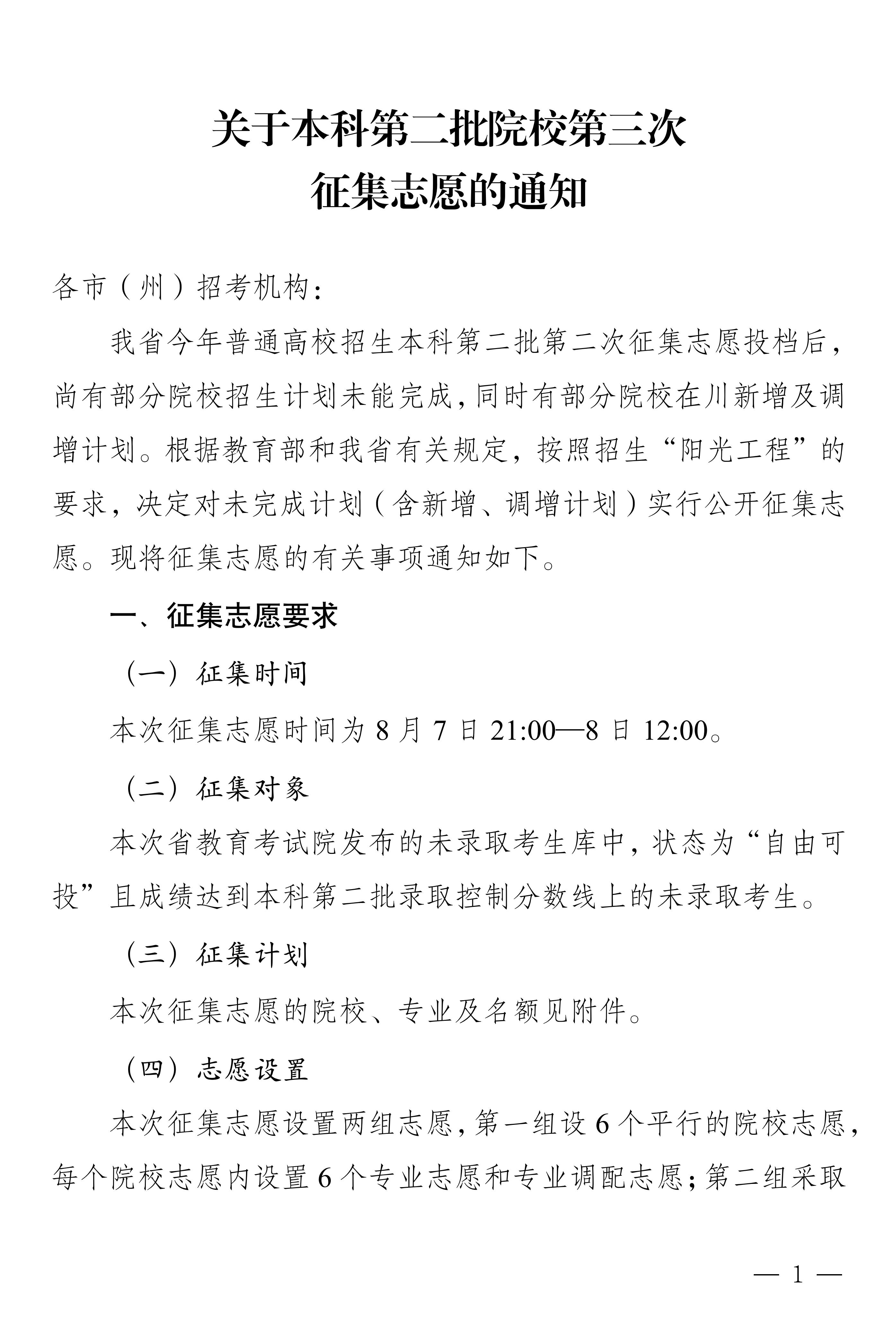 关于本科第二批院校第三次征集志愿的通知