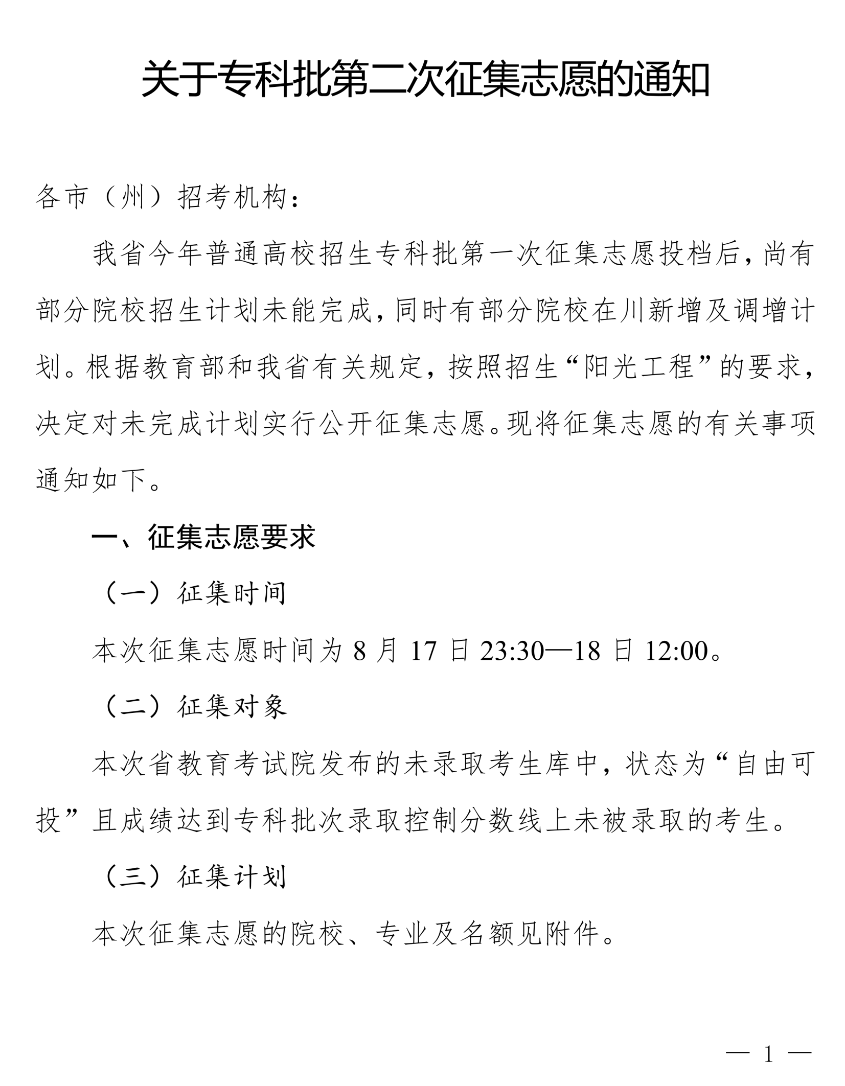关于专科批第二次征集志愿的通知