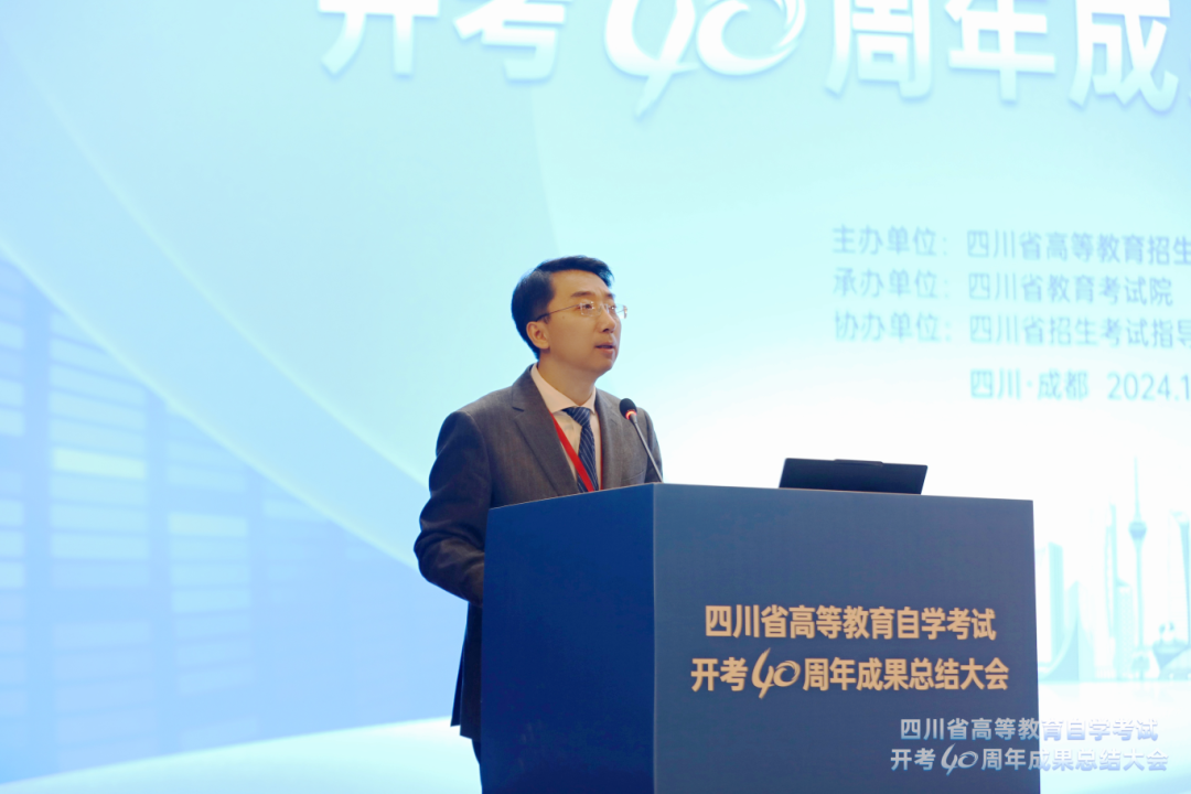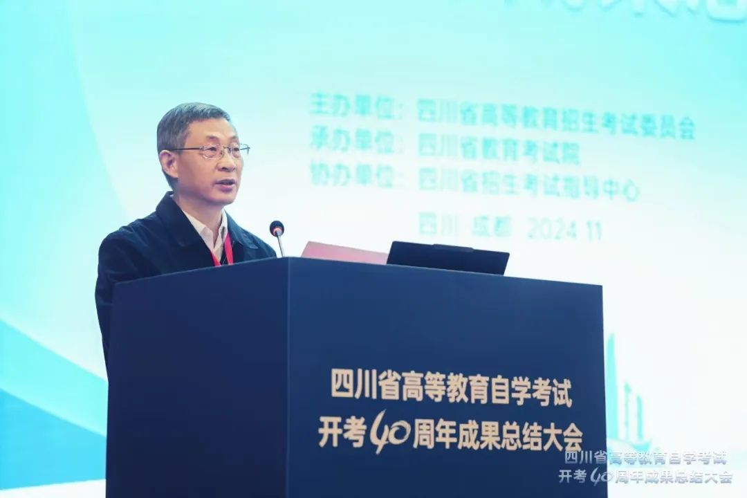 20241119日,四川省高等教育自学考试开考40周年成果总结大会在成都召开。教育部教育考试院副院长高升出席会议并讲话;省委教育工委书记,教育厅党组书记、厅长余孝其致辞。省委教育工委副书记,教育厅党组成员,一级巡视员陈朝先主持会议。