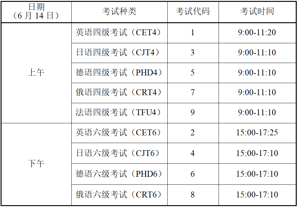 笔试(CET)考试时间为6月14日,开考科目为英语、日语、德语和俄语4个语种的四级和六级及法语四级。