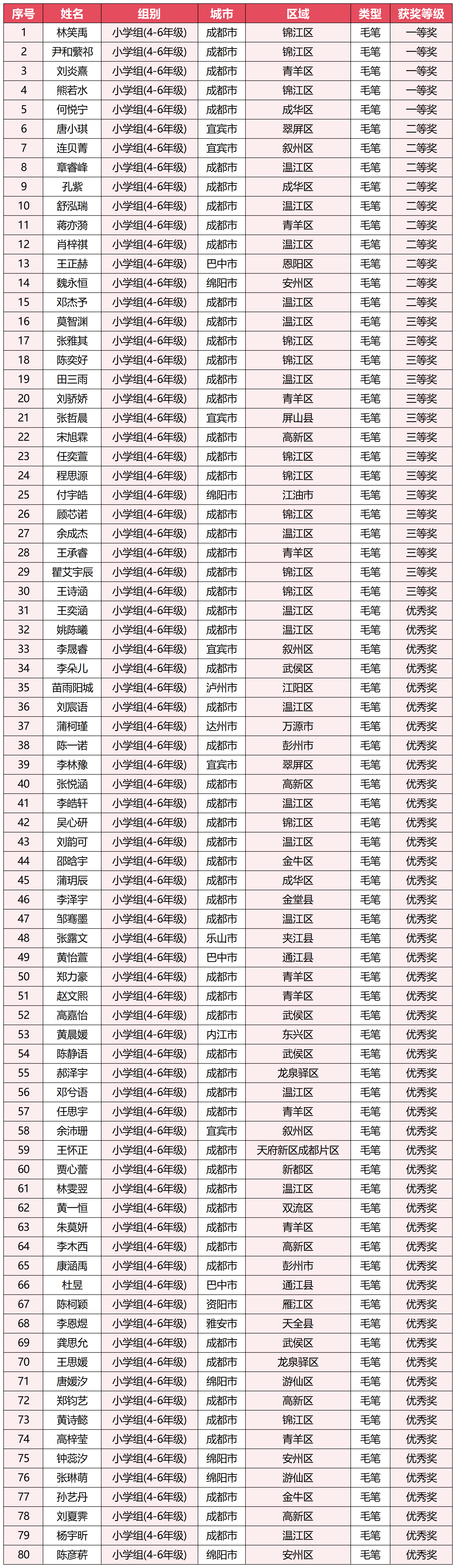 我省第二届中小学师生“书法人生·墨香校园”主题书法大展公益活动评选工作已圆满结束。经过评审专家组初评和复评,已评选出毛笔类和硬笔类的一、二、三等奖和优秀奖,现予以公示,公示期为7月14日至7月18日(共5个工作日)。公示期间,任何单位或个人如对获奖名单有异议,均可通过电话形式反映,举报电话:028-86654294。