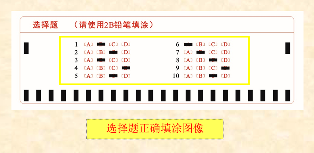 ▶如果某个选项被墨水等物质沾污,会影响计算机识别、评分,如下图所示: